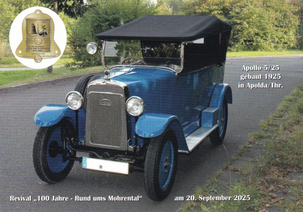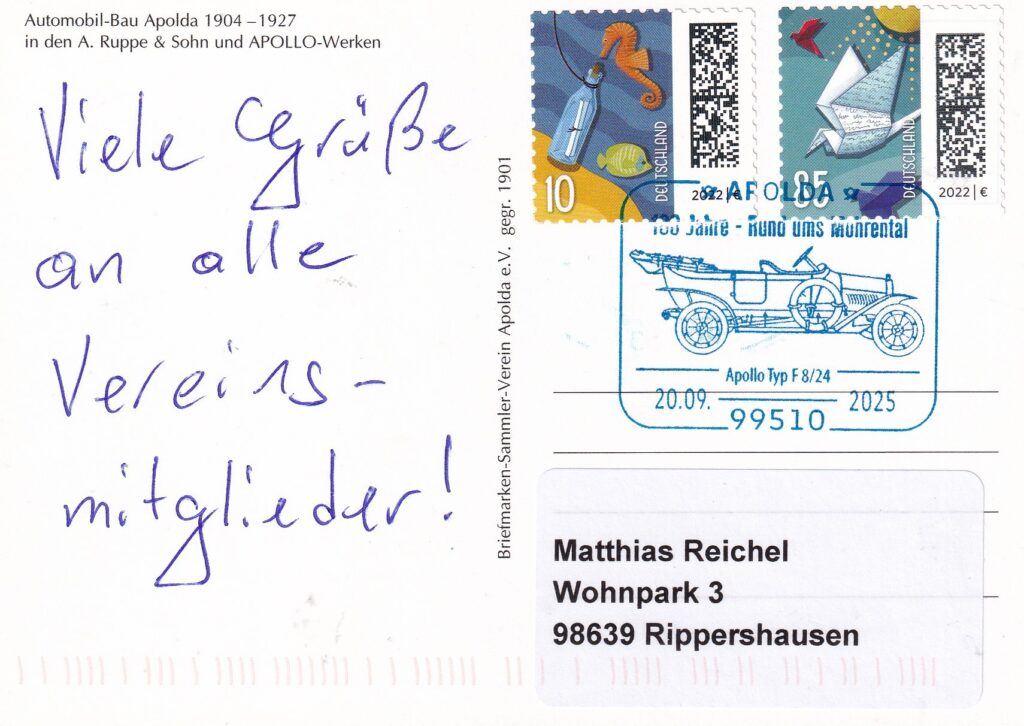 Abgebildetes Fahrzeug wurde 1925 in Apolda Gebaut. Sonderstempel vom 20.09.2025. Grüße an alle Vereinsmitglieder!