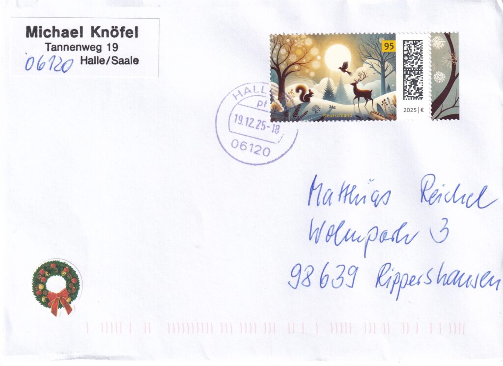 Weihnachts- und Neujahrsgrüße vom 1.Vorsitzenden der BArGe Bahnpost e.V. Michael Knöfel Veröffentlicht am 3. Januar 2026 von Matthias Reichel Michael Knöfel aus Halle sendet Grüße!
