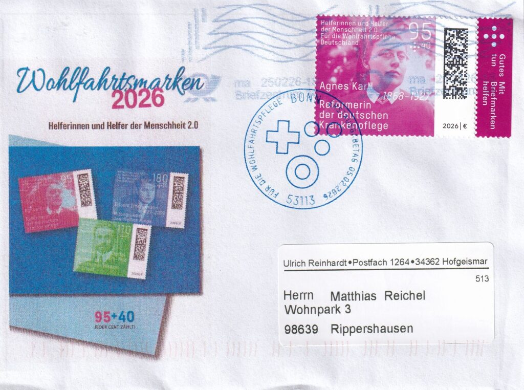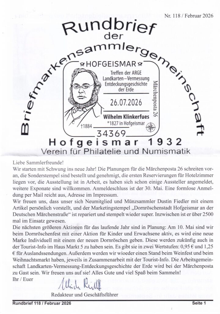 Rundbrief von Hofgeismar eingetroffen mit Hinweis auf den Sonderstempel Veröffentlicht am 26. Februar 2026 von Matthias Reichel Schöner Beleg, leider doppelt gestempelt! Rundbrief von Hofgeismar eingetroffen.